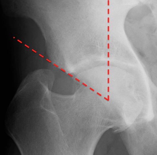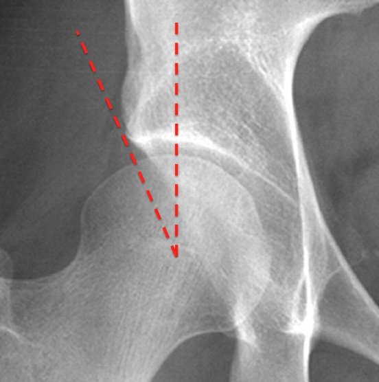 angle formed by a vertical line and a line connecting the femoral head center with the lateral edge of the acetabulum. compare normal (figure 1) with abnormal over coverage (figure 2)