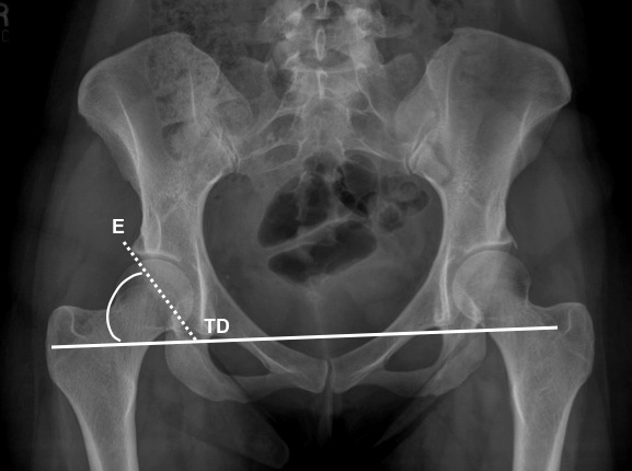 using the AP view of the hip, angle formed between lateral margin of acetabular roof or lateral sourcil (E) and inferior aspect of the pelvic "teardrop" (TD) and horizontal line between the inferior aspect of both pelvic "teardrops"