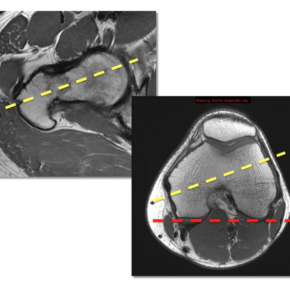 angular difference between axis of femoral neck (yellow line) and transcondylar axis of the knee (red line). male avg 8 degrees, female 15 degrees. birth 30-40 degrees anteversion.
