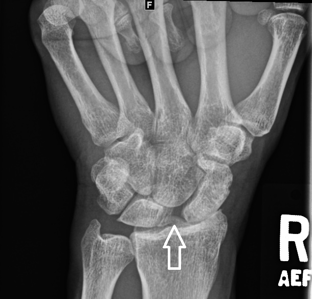 using the AP view of the wrist, identify distance between scaphoid and lunate. The distance is between the proximal ulnar corner of the scaphoid and the proximal radial corner of the lunate.